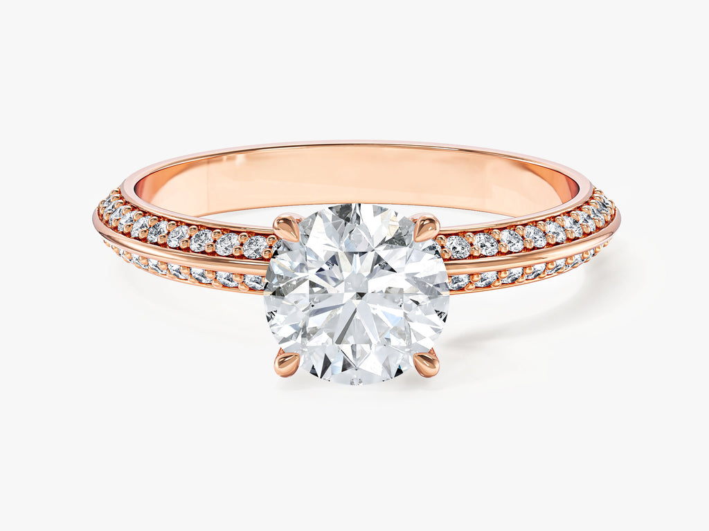 Dieser Verlobungsring mit runden Moissaniten im Pavé-Stil besticht durch 44 zierliche Moissanite, die im Pavé-Stil gefasst sind. Der zentrale Stein ist ein 1,00 Karat schwerer, brillantgeschliffener Moissanit, der dem Ring eine luxuriöse Ausstrahlung verleiht.