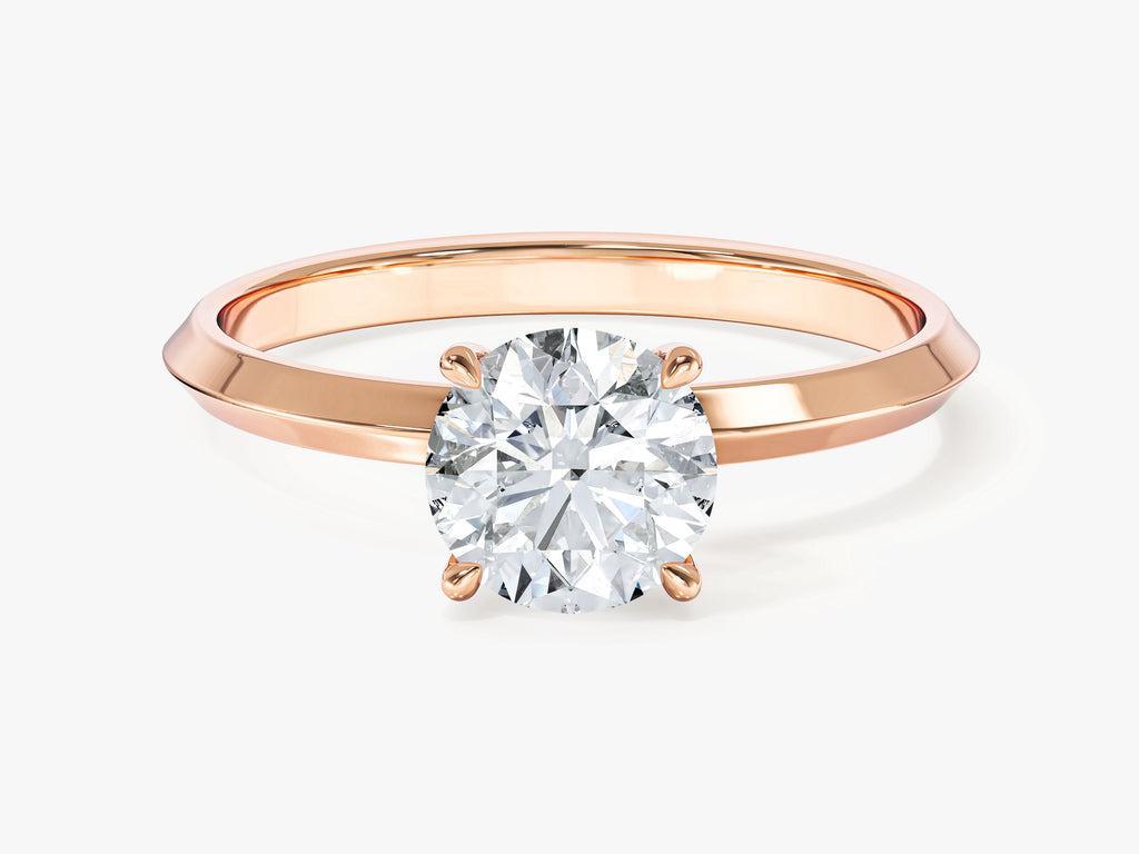 The Knife Edge Round Moissanite Engagement Ring (1.00 CT) features a stunning 1.00-carat round moissanite at its center, renowned for its brilliant sparkle and fire. The ring is designed with a knife-edge band, characterized by sharply raised edges that create a sleek, modern profile. This design not only adds a contemporary touch but also enhances the visual prominence of the moissanite, making it a captivating focal point.
