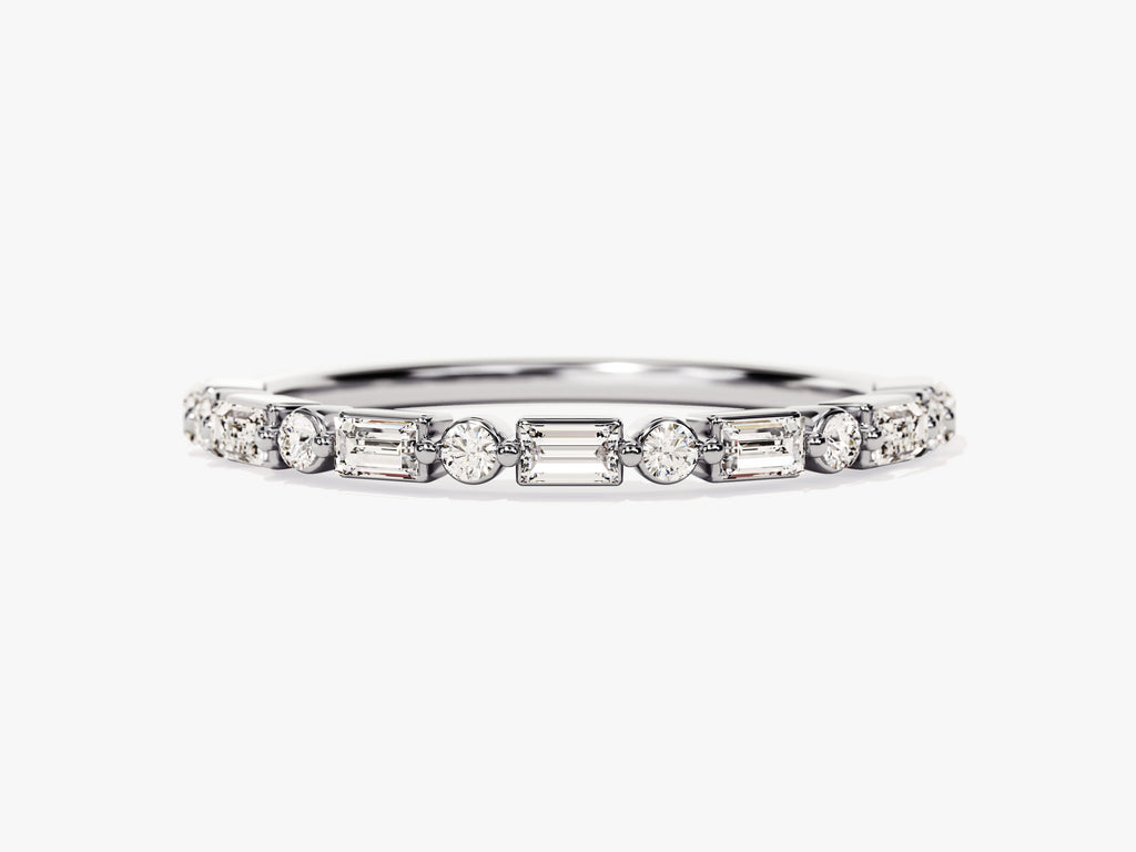 Each round diamond sits between baguette diamonds in complementary bezel settings that add dimension to this stunning wedding band. Expertly crafted by our skilled jewelers, this exquisite design offers a timeless style that's sure to last with years of wear.