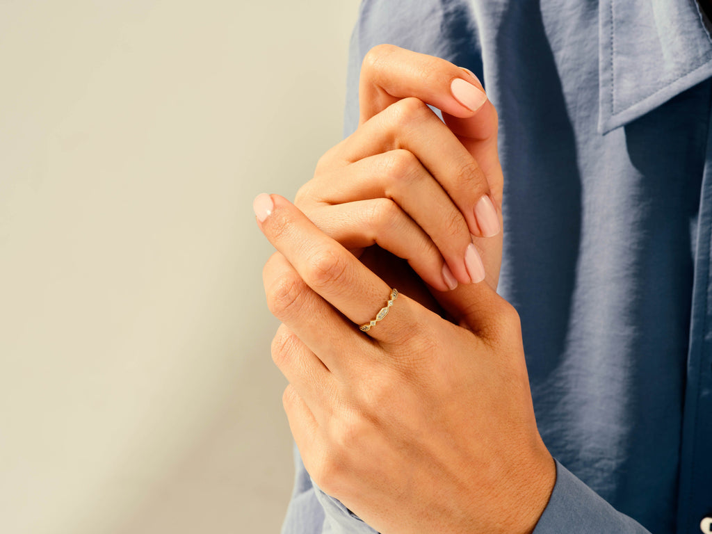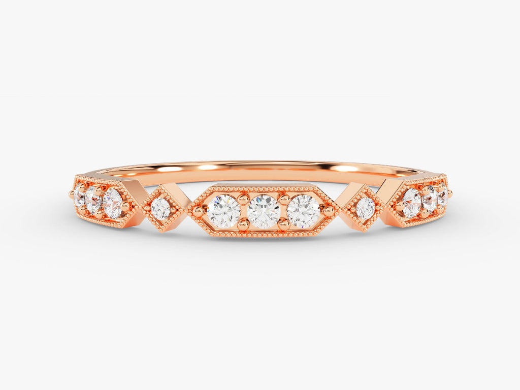 Say "I do" in style with our Art Deco inspired diamond wedding band. With its unique design and exquisite craftsmanship, this ring is sure to steal the spotlight. Milgrain detailing and sparkling diamonds reflect the soul and the glamour of past eras. It's a piece of history you can wear every day.