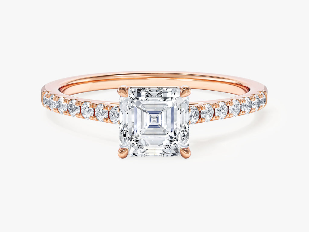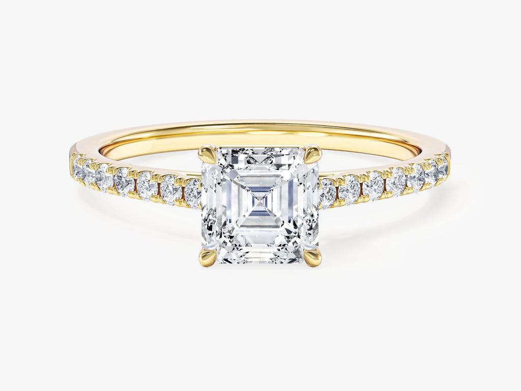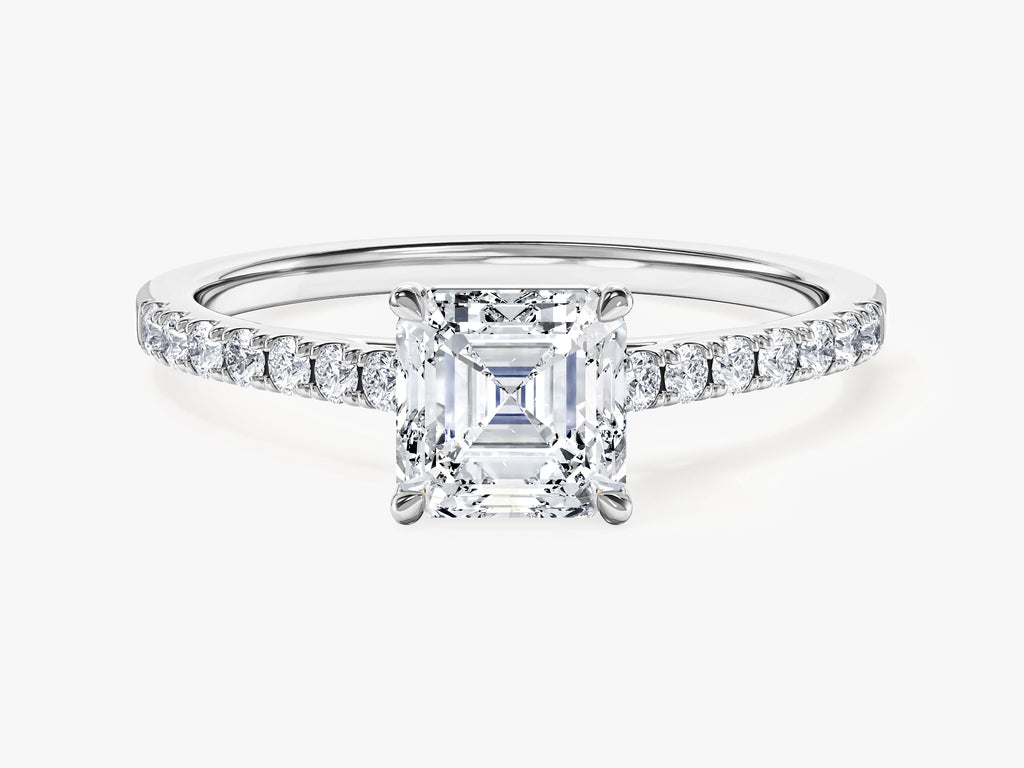 The Asscher Cut Lab Grown Diamond Engagement Ring with Pave Set Side Stones combines classic sophistication with a modern twist, making it the perfect symbol of your everlasting love. The centerpiece of this ring is a brilliant Asscher cut lab-grown diamond, expertly crafted to showcase its breathtaking beauty and exceptional clarity. Its precise geometric facets create a timeless appeal, capturing and reflecting light in a mesmerizing display of sparkle.