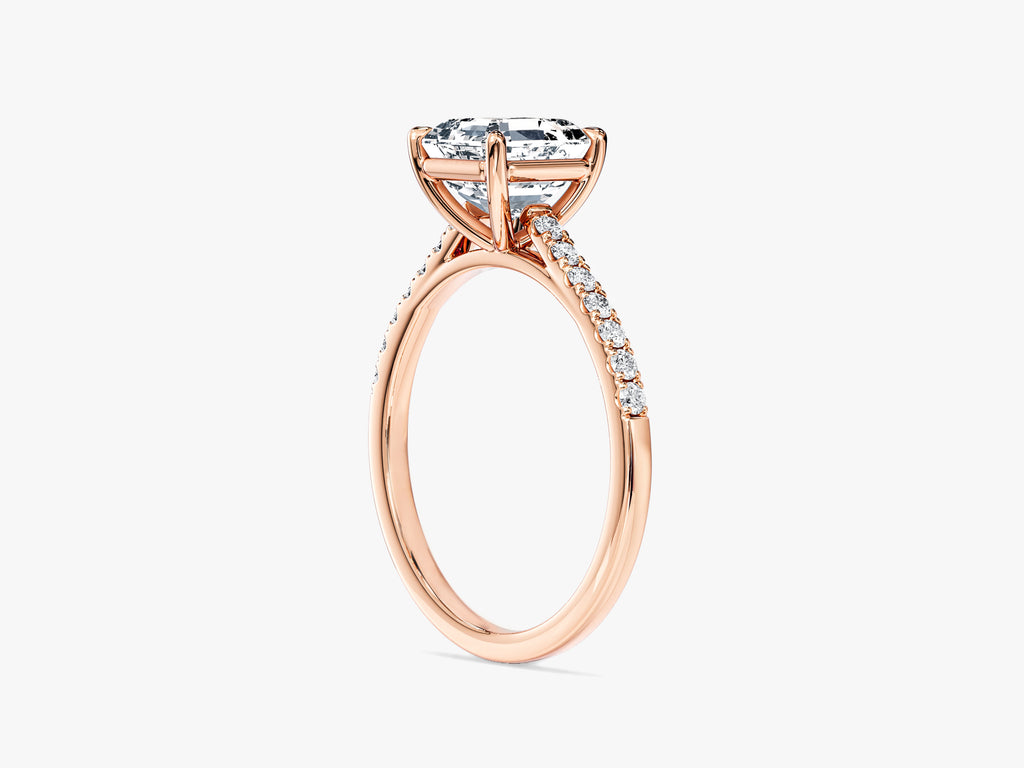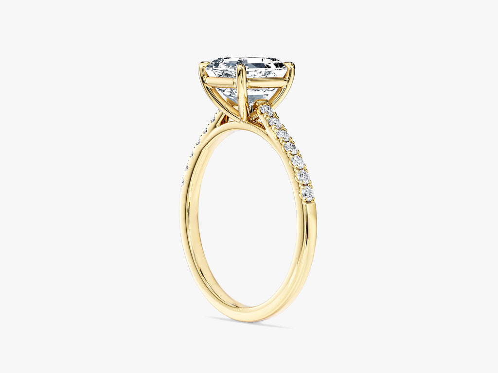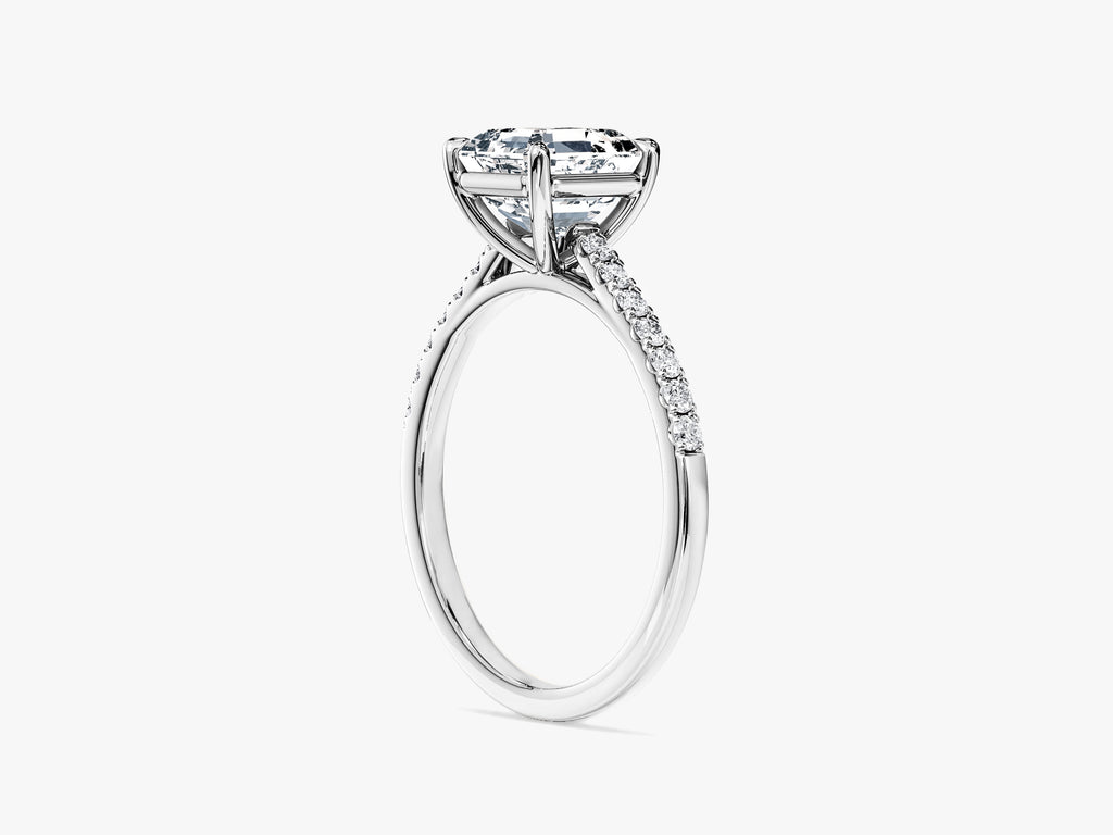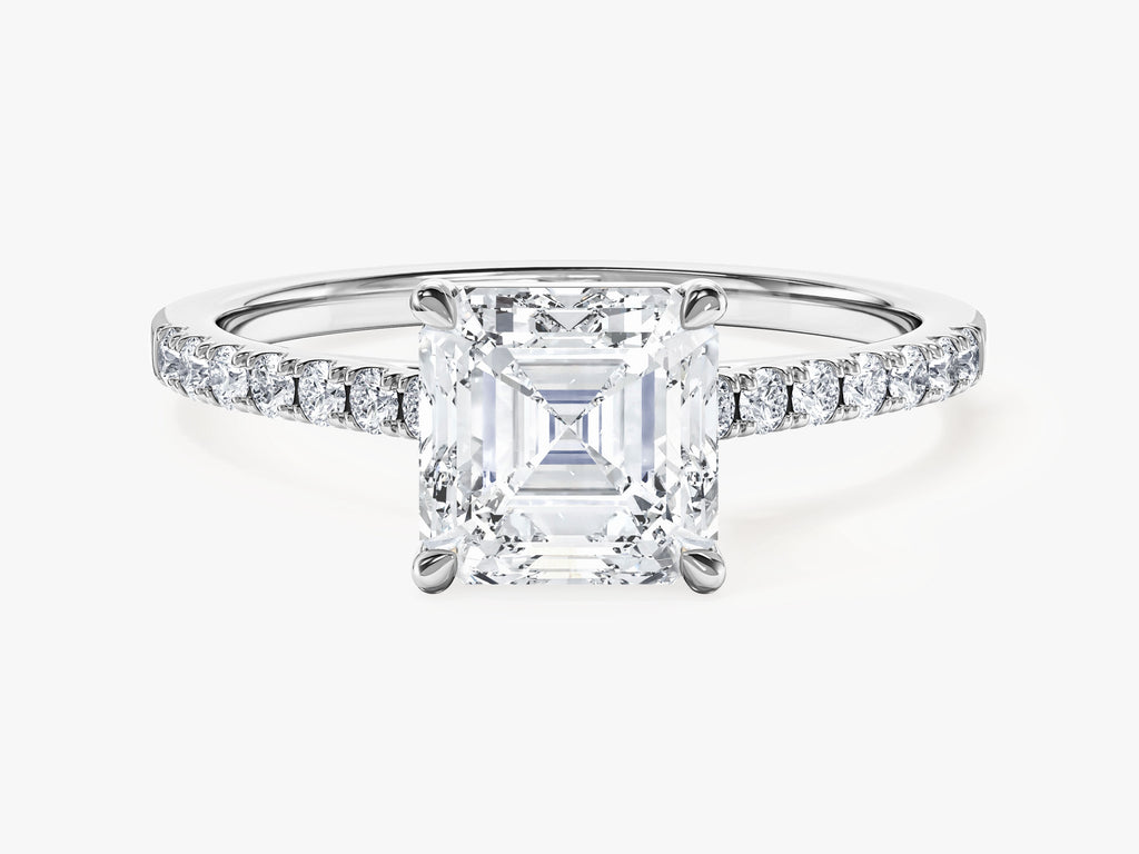 Introducing our Asscher Cut Lab Grown Diamond Engagement Ring with Pave Set Side Stones – a masterpiece of elegance and sustainability. To enhance the beauty of the Asscher cut diamond, we've adorned the band with a delicate and dazzling pave setting. A stunning array of smaller lab-grown diamonds elegantly encircle the main stone, adding an extra layer of brilliance and luxury to this already magnificent piece.