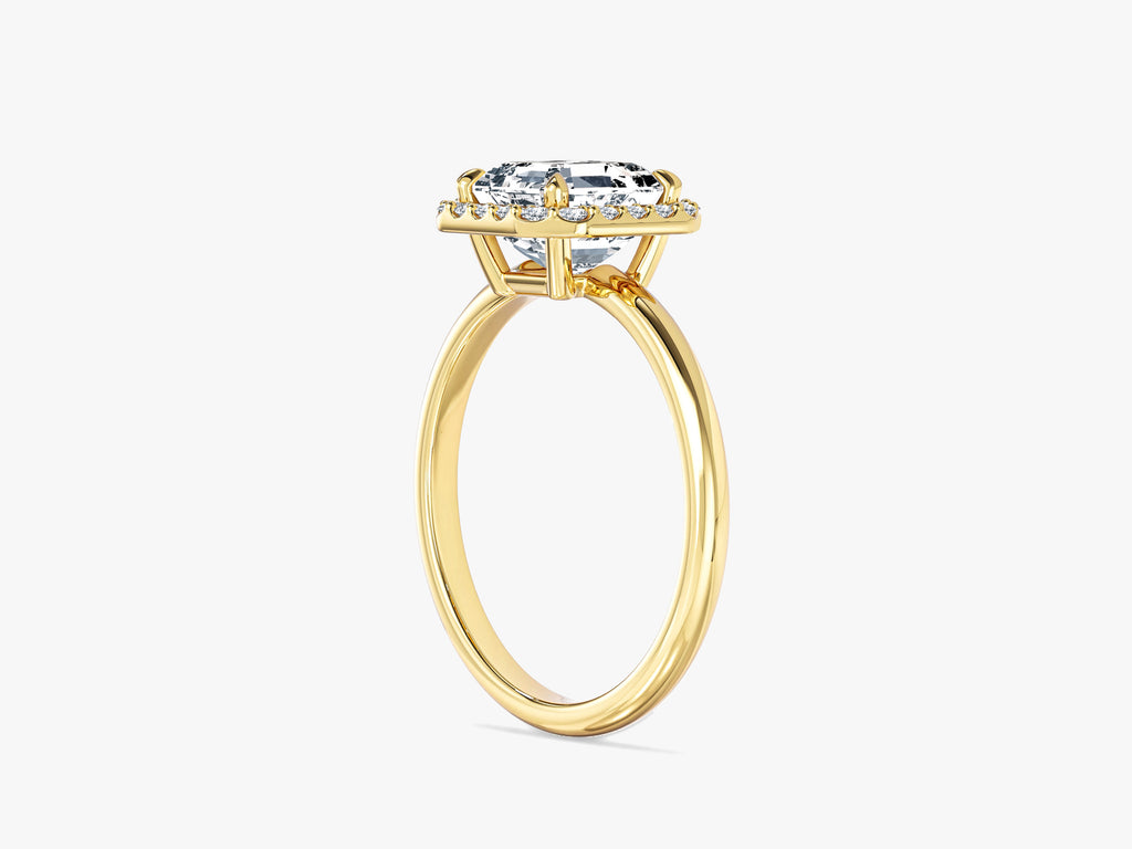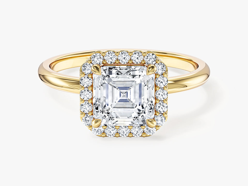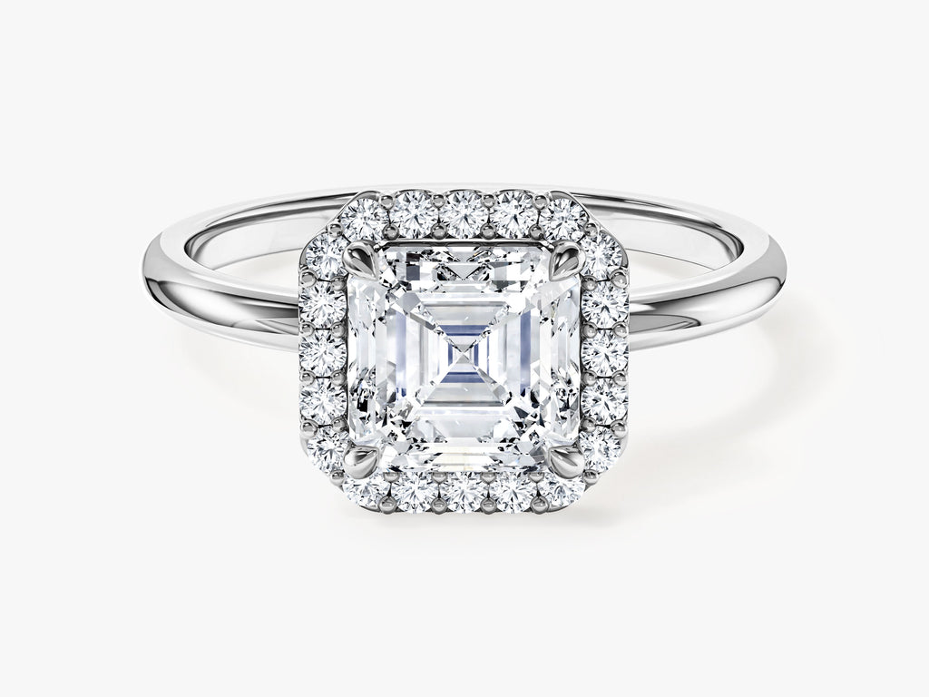 Immerse yourself in the enchanting beauty of our Asscher Halo Moissanite Engagement Ring. The stunning Asscher-cut moissanite at the center of this ring exudes a captivating brilliance, surrounded by a delicate halo of sparkling accent stones that enhance its radiance. The artful design combines classic elegance with modern allure.