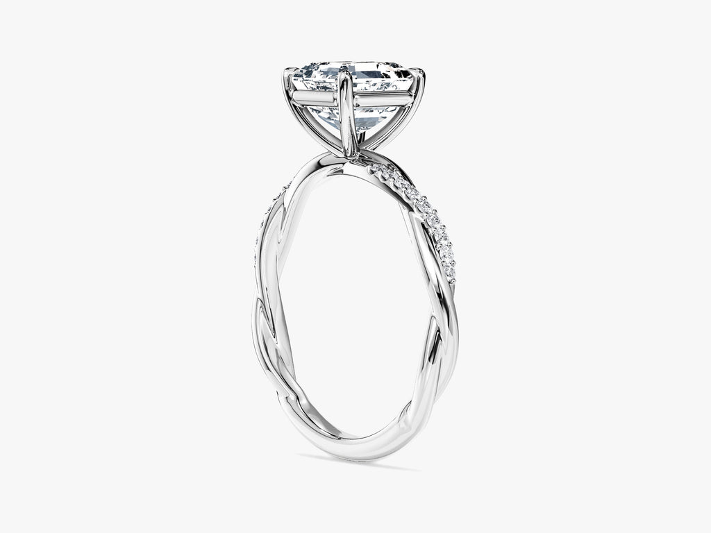 The Asscher Twisted Lab Grown Diamond Engagement Ring with Pave Set Side Stones features a stunning Asscher cut lab-grown diamond. The square-shaped facets of the Asscher cut to provide a unique and mesmerizing play of light, ensuring that your love shines brilliantly. The center diamond is gracefully embraced by a twisted band design, adding a touch of contemporary flair to the ring's classic appeal.