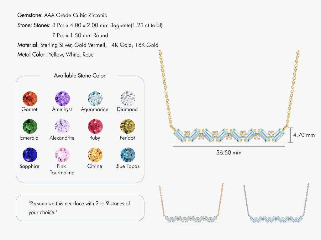 This delicate necklace is adorned with sparkling birthstones in iconic baguette shape. In between, tiny diamonds sparkle and create a beautiful contrast between the lively colors of birthstones and the clear sparkle of diamonds. You can pick a gemstone that's your birthstone, or maybe one that reminds you of someone special to create a custom necklace. Either way, it’ll become a cherished piece you'll wear every day.