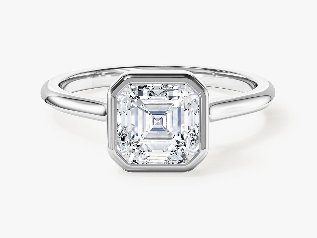 The Bezel Asscher Lab Grown Diamond Engagement Ring is a striking and modern symbol of love. At its heart, this brilliant ring showcases a magnificent Asscher-cut lab-grown diamond. The square-shaped facets of the Asscher cut to provide a mesmerizing play of light, ensuring that the diamond stands out as a symbol of your journey together.
