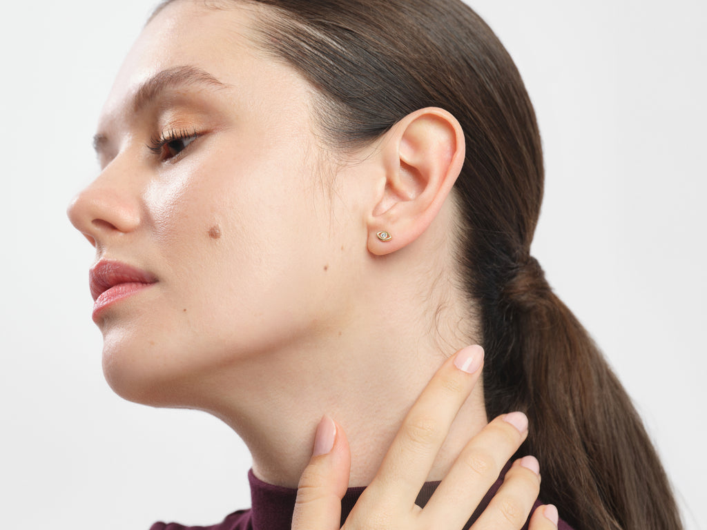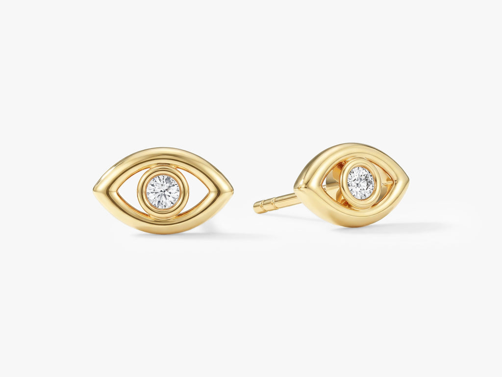 Protect yourself in style with this evil eye bezel earring. Featuring a bezel-set diamond - moissanite stone at the center of the iconic evil eye design, this earring adds a touch of sparkle and mystique to any outfit.