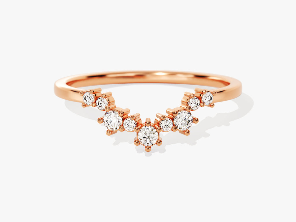 Looking for a dainty and minimalist wedding band that shines flaringly? This curved cluster diamond is meant for you. As it's perfectly stackable and versatile, it pairs seamlessly with other rings or stands out on its own. This band is crafted for a comfortable fit, so you can wear it all day without a worry.