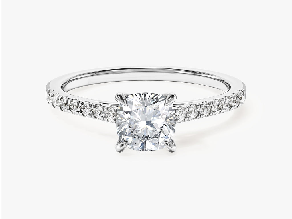 Explore our exquisite Cushion Cut Lab Grown Diamond Engagement Ring with Pave Set Side Stones. This splendid ring showcases a brilliant cushion-cut lab-grown diamond, carefully designed to enhance its remarkable clarity and captivating allure. The delicate pave setting, adorned with ethically sourced side stones, adds an extra layer of brilliance.