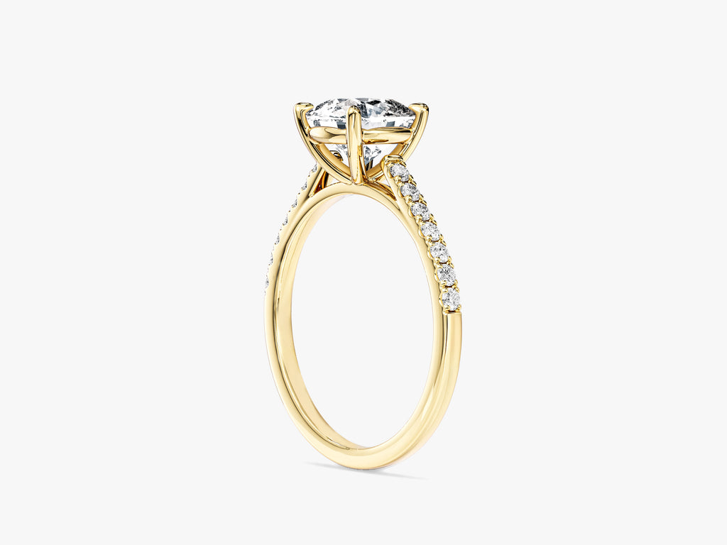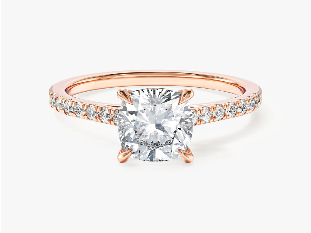 Elevate your love with the Cushion Cut Lab Grown Diamond Engagement Ring with Pave Set Side Stones. At its heart, a stunning cushion-cut lab-grown diamond takes center stage, expertly crafted to enchant with its exceptional clarity and unique appeal. The band, adorned with meticulously set pave side stones, adds an extra layer of shimmer and elegance.