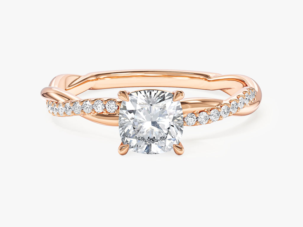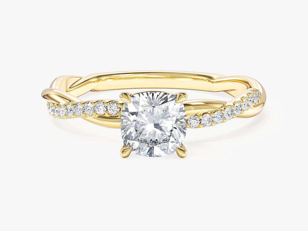 Our Cushion Twisted Lab Grown Diamond Engagement Ring with Pave Set Side Stones features a brilliant cushion-cut lab-grown diamond, expertly crafted to enhance its exceptional clarity and captivating charm. The unique and modern twisted band design symbolizes the intricate journey of your love. The meticulously set pave side stones on the band add an extra layer of brilliance and opulence to the design.