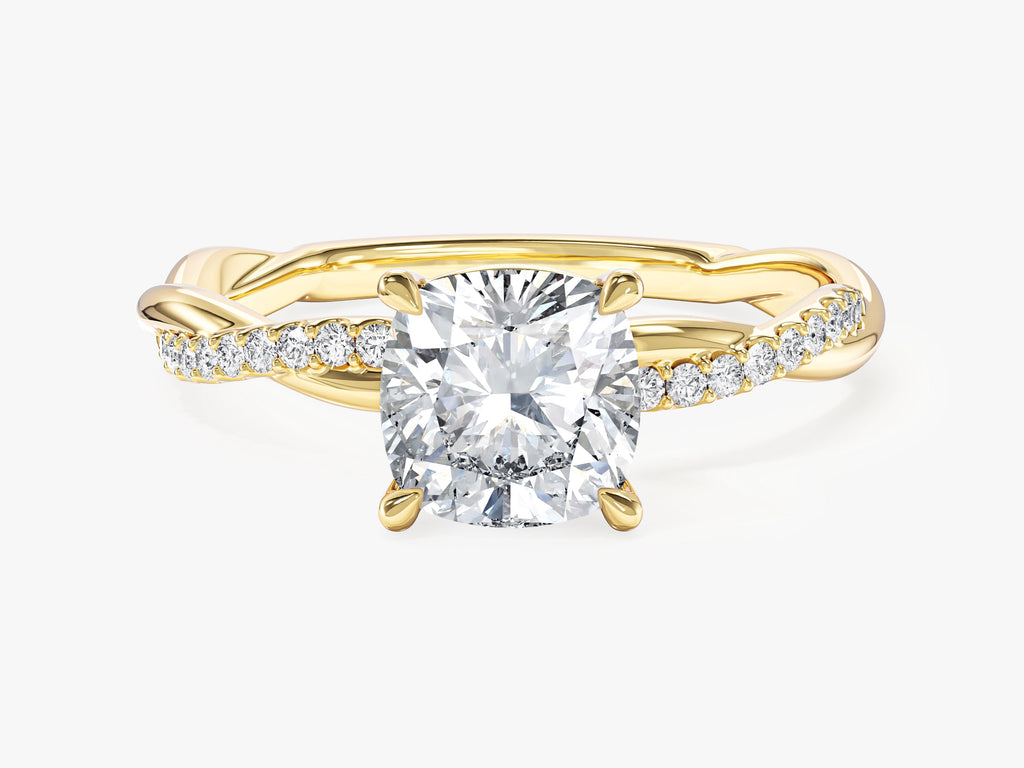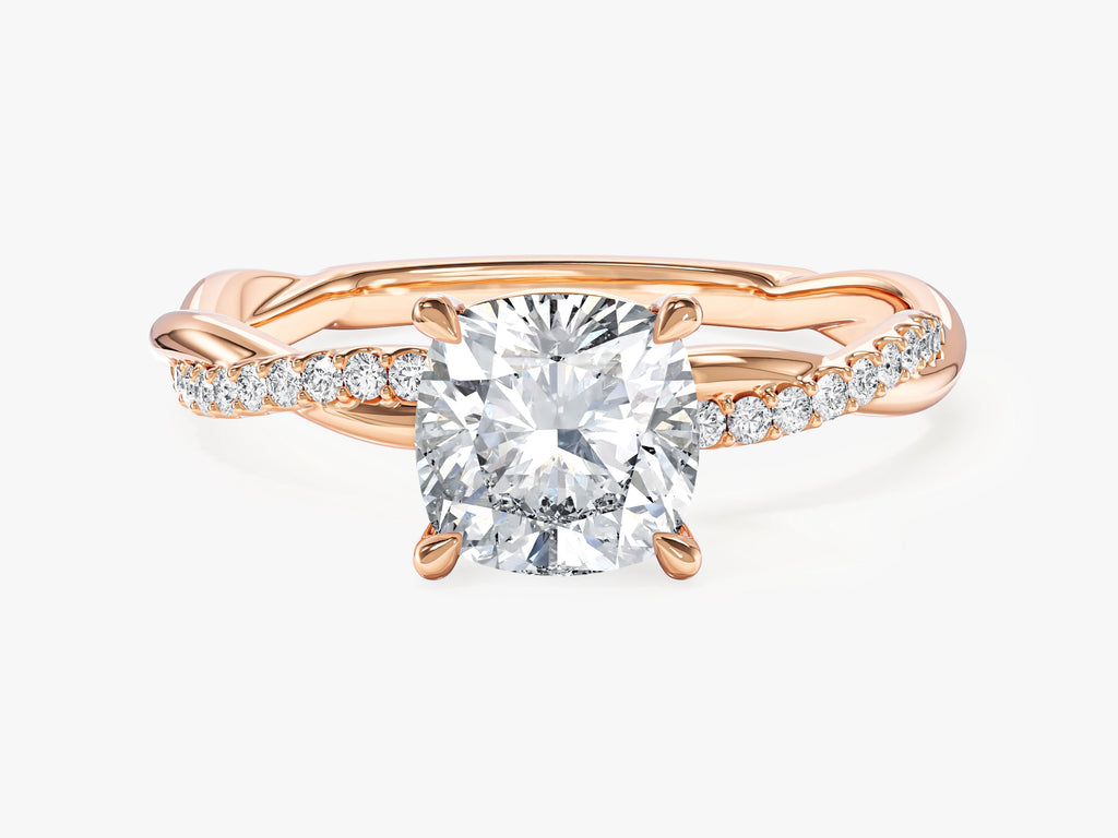 Elevate your love story with the Cushion Twisted Lab Grown Diamond Engagement Ring featuring Pave Set Side Stones, a seamless blend of timeless beauty and contemporary elegance. At its heart, a dazzling cushion-cut lab-grown diamond takes center stage, designed to captivate with its remarkable clarity and unique allure. The twisted band design adds a modern twist to the ring, representing the intricate and unique path of your love. Meticulously set pave side stones on the band add an extra layer of brilliance.