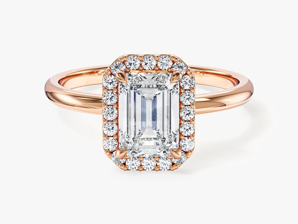 Elevate your love story with timeless elegance using our Emerald Halo Moissanite Engagement Ring. This exquisite ring features a stunning emerald-cut moissanite center stone, celebrated for its captivating brilliance and classic charm. It is encircled by a radiant halo of smaller moissanite stones, creating a breathtaking display of shimmer and opulence.