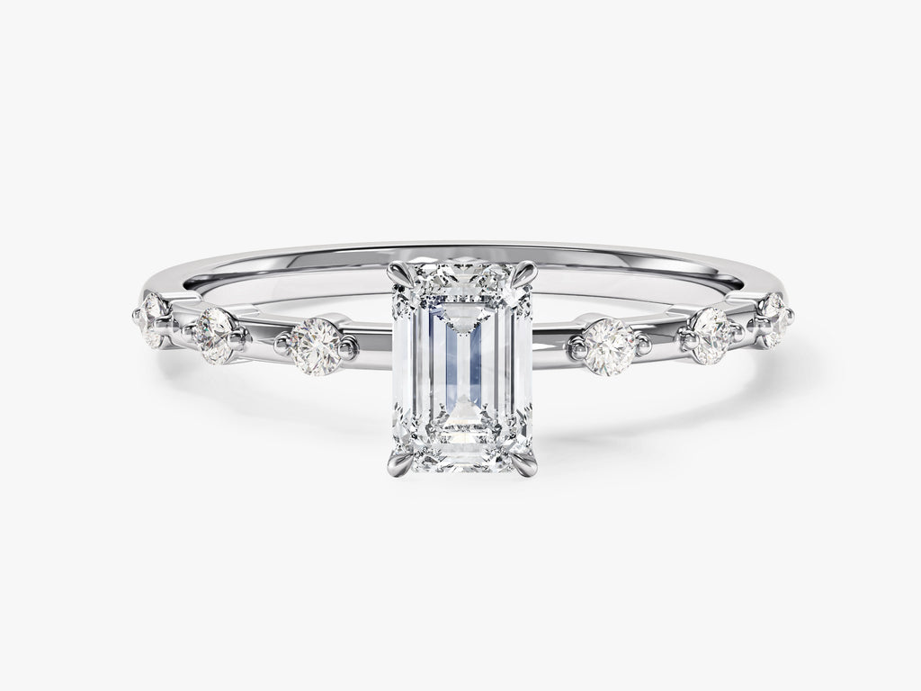 This engagement ring showcases a stunning emerald-cut moissanite center stone, flanked by a band of sparkling moissanite accents, offering a sleek and modern design with timeless sophistication.