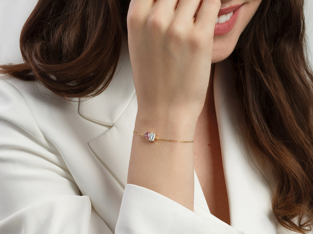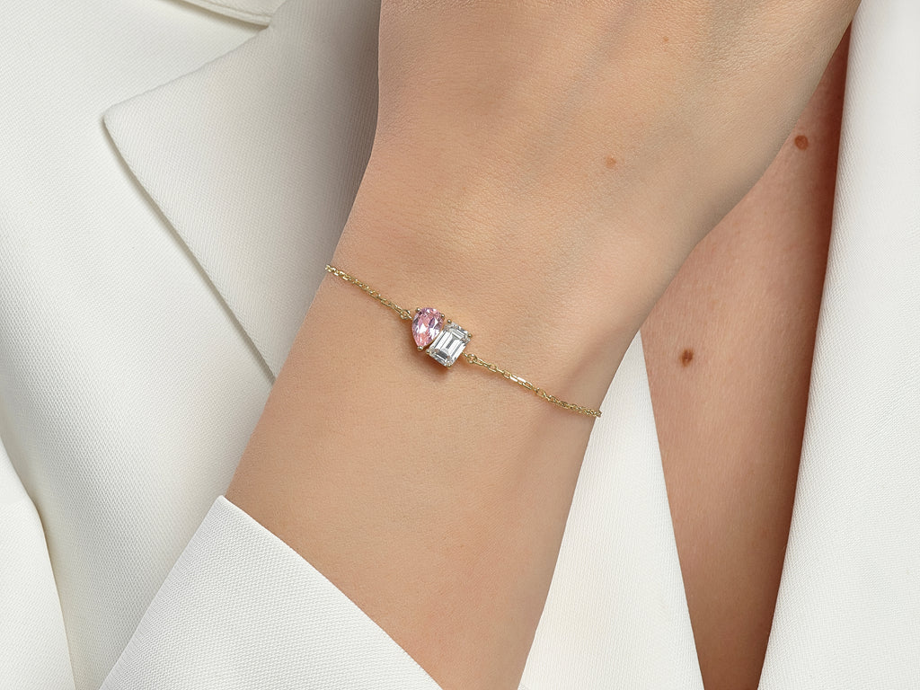 A luminous emerald meets a graceful pear-cut birthstone, creating a harmony of color and meaning on your wrist. Designed to celebrate your story, this bracelet shines with beauty that feels deeply personal.