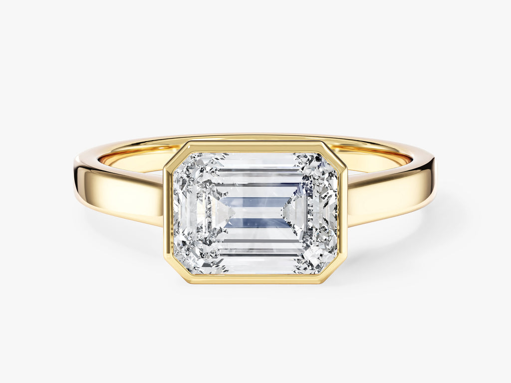 A sleek flat band showcases a stunning emerald-cut center stone, highlighting its clean lines and classic brilliance. Timeless elegance meets modern refinement in one striking piece.