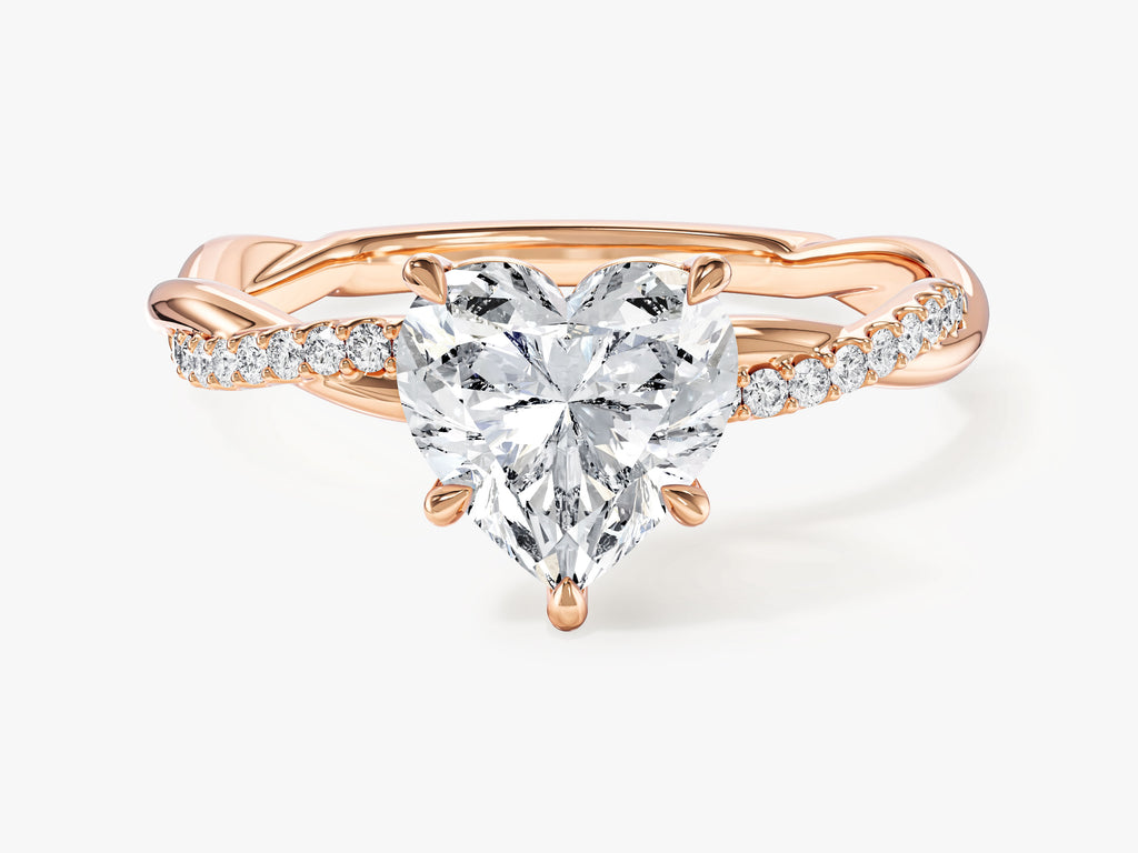 Elevate your love story with the Heart Twisted Lab Grown Diamond Engagement Ring featuring Pave Set Side Stones. At its heart, a dazzling heart-cut lab-grown diamond takes center stage, designed to captivate with its remarkable clarity and unique allure. The band's intricate twist design adds a modern twist to the ring, symbolizing the unique path of your love.