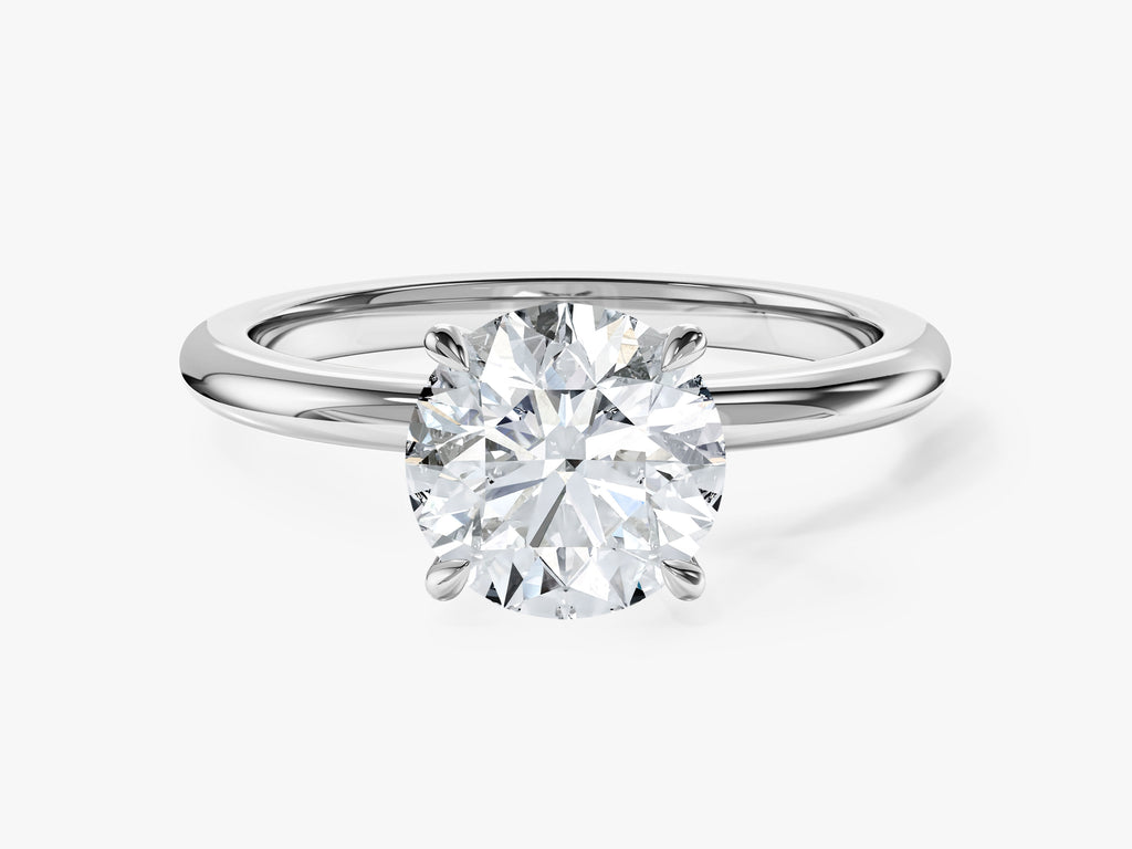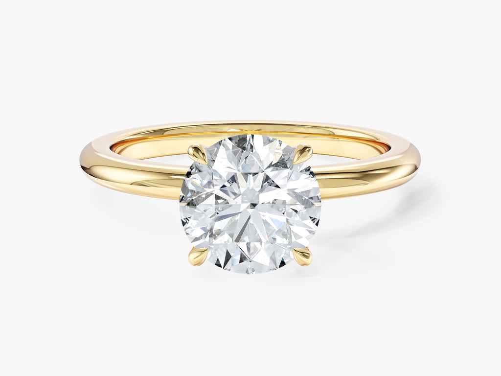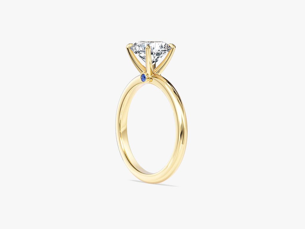 Exquisite and graceful, this engagement ring in 14k gold features a hidden gemstone on its band to complement your round-shaped center stone.
