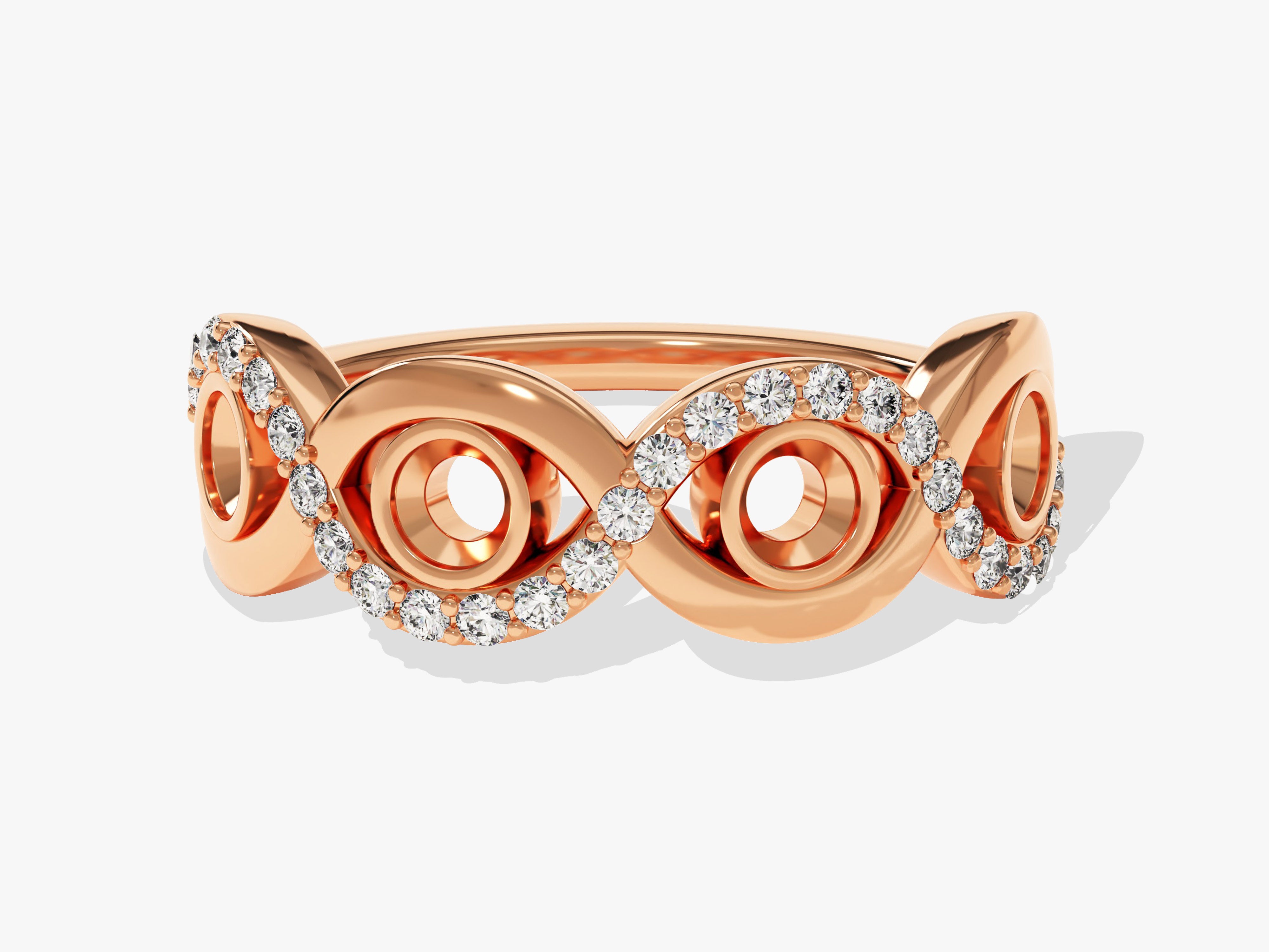 This lovely birthstone ring has a unique design that features a beautiful arrangement of four round-cut birthstones. The diamonds gracefully curve around the band and those round gemstones. These interconnected loops create a sense of infinity which symbolizes forever love and connection. This meaningful and beautiful ring makes a thoughtful, personalized gift for someone you deeply care about.
