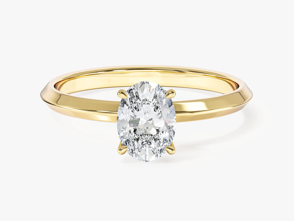 Revel in the timeless allure of our Knife Edge Oval Lab Grown Diamond Engagement Ring, a graceful fusion of classic charm with a contemporary edge. This exquisite ring showcases a brilliant oval-cut lab-grown diamond, meticulously crafted to enhance its exceptional clarity and captivating allure. The knife-edge band design introduces a modern twist.