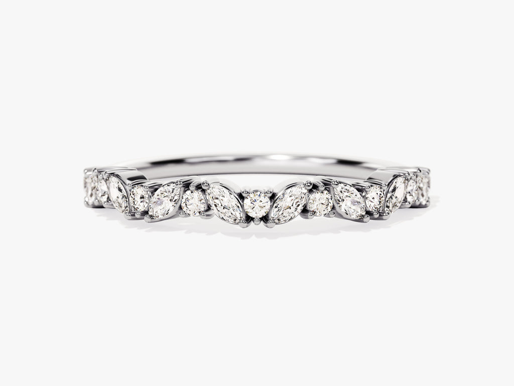 Stunning round and captivating marquise diamonds are set successively to create a dazzling look that's impossible to ignore. Wear this sleek band proudly on your wedding day or anniversary as a symbol of your promise, then let it accompany you on every journey that follows. It's sure to become a treasured piece that will remind you of the love and joy you share each and every day.