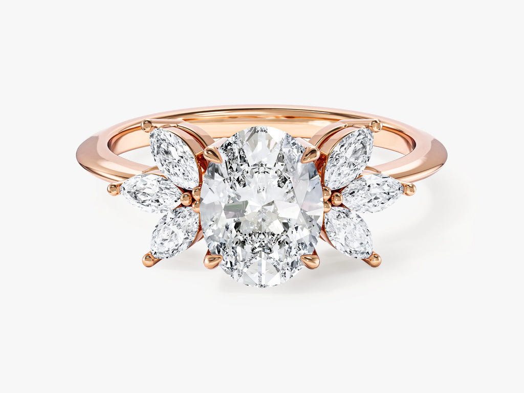 Elegant and charming, this moissanite engagement ring in 14k gold features a cluster of 6 marquise-shaped sparkling stones to complement your oval-shaped center stone.