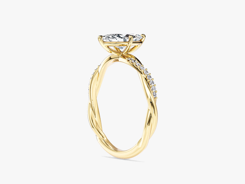 Prepare to be entranced by the elegance of our Marquise Twisted Lab Grown Diamond Engagement Ring with Pave Set Side Stones, a masterpiece that seamlessly blends classic charm with modern opulence. This extraordinary ring features a brilliant marquise-cut lab-grown diamond, meticulously crafted to enhance its exceptional clarity and captivating charm. The unique twisted band design and the delicate pave setting add a contemporary twist, symbolizing the intricate journey of your love.