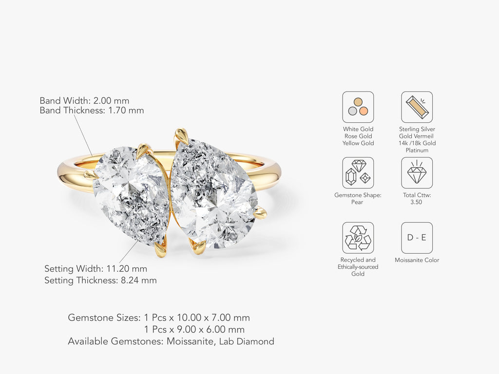 Effortlessly modern and endlessly romantic, this design celebrates balance and connection through its elegant Toi et Moi design. Pear-cut gemstones pairs harmoniously, symbolizing two souls intertwined. With its sculptural lines and radiant sparkle, it embodies the modern love story; bold, refined, and beautifully unique.