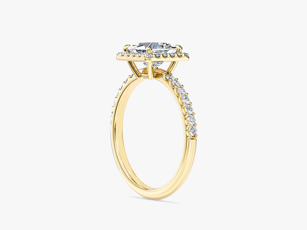Behold the exquisite beauty of our Princess Halo Lab Grown Diamond Engagement Ring with Pave Set Side Stones, a symbol of your eternal love story. The brilliant princess-cut lab-grown diamond is surrounded by a halo of smaller lab-grown diamonds, casting a radiant aura of elegance and grandeur. The band features meticulously pave-set side stones that add an extra layer of sparkle and sophistication to this dazzling masterpiece.