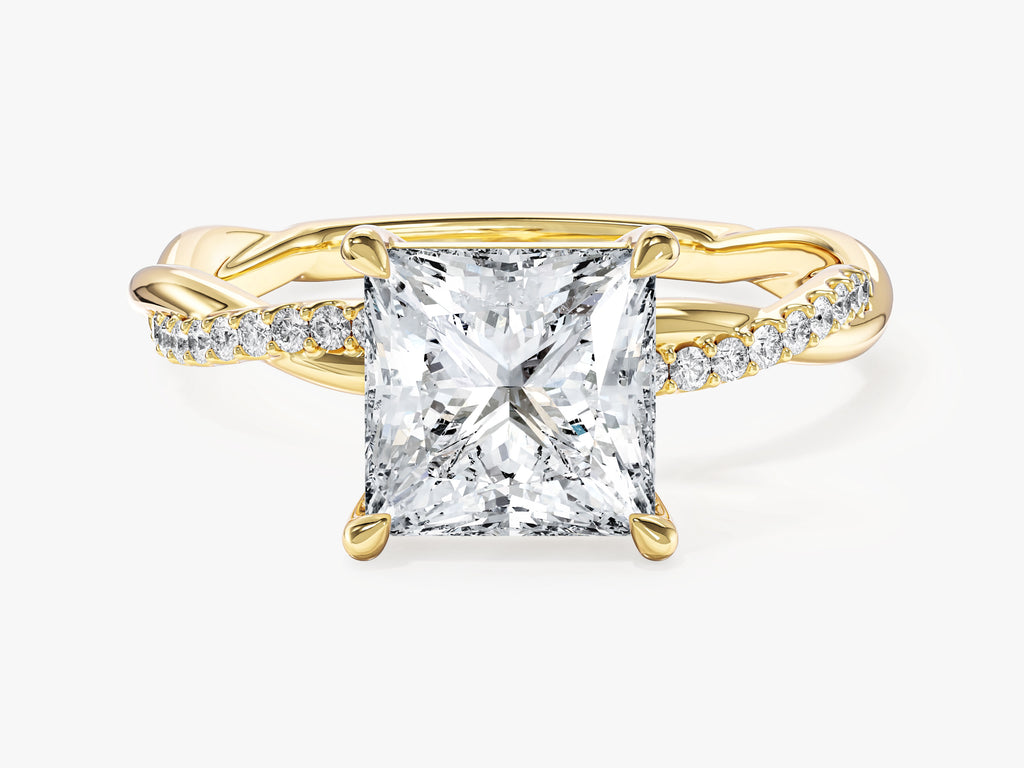 Elevate your love to new heights with our Princess Twisted Lab Grown Diamond Engagement Ring featuring Pave Set Side Stones. The intricately twisted band adds a touch of individuality to this elegant ring, while the pave-set side stones enhance its beauty with a hint of opulence and sophistication.