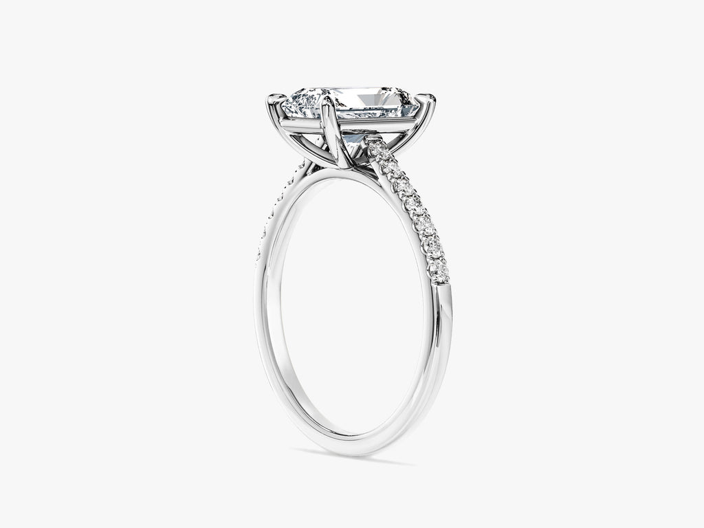 Elevate your love story with the timeless allure of our Radiant Cut Lab Grown Diamond Engagement Ring featuring Pave Set Side Stones. The resplendent radiant-cut lab-grown diamond radiates with unmatched brilliance, creating an enchanting display of sparkle and magnificence. The finely crafted band, embellished with meticulously pave-set side stones, adds a hint of opulence and sophistication.