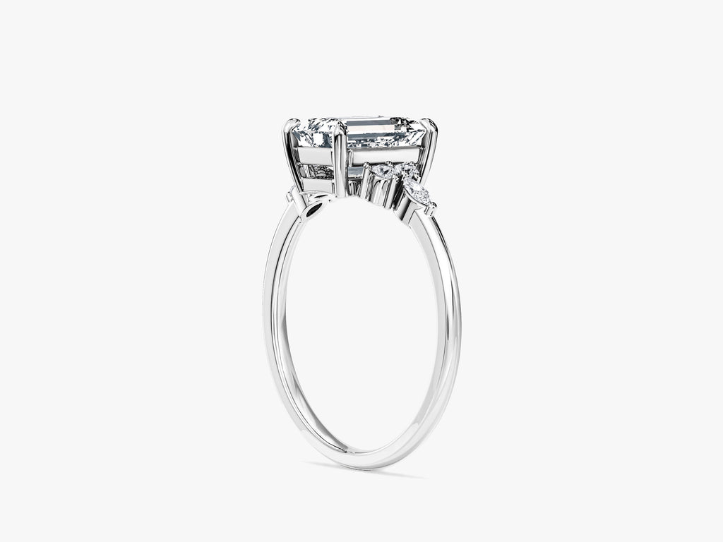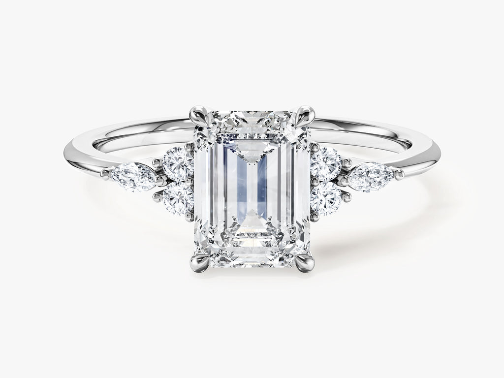 The Round and Marquise Cluster Emerald Lab Grown Diamond Engagement Ring is a breathtaking masterpiece that blends timeless allure with contemporary flair. At the center of this extraordinary ring is a brilliant emerald-cut lab-grown diamond, capturing the essence of eternal love with its timeless sparkle. Surrounding the central lab diamond is a mesmerizing cluster of smaller marquise and round-cut lab-grown diamonds arranged in a graceful dance that radiates elegance and sophistication.