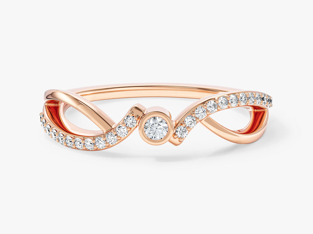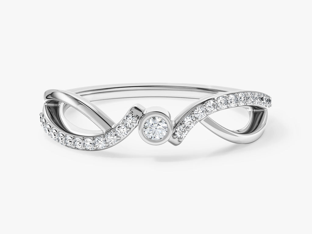 This ring features a bezel-set center moissanite embraced by a twisted infinity band adorned with sparkling moissanites. The intricate design adds a unique touch, symbolizing everlasting love and elegance.