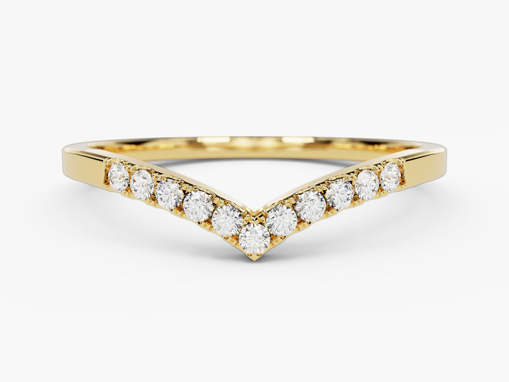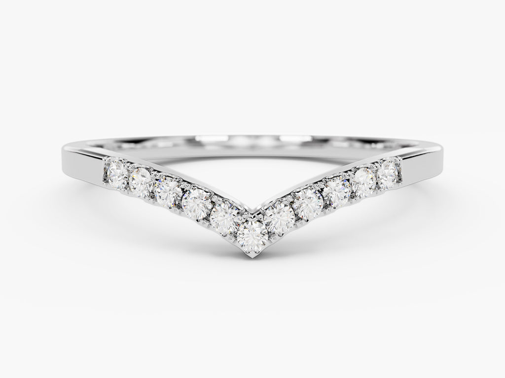 This V-shaped band boasts eleven alluring diamonds set in deeply curved chevron shape. It has a classic yet modern stylish look that can never go out of fashion. It is a beautiful complement to many engagement ring styles and looks lovely either when stacked or worn alone.