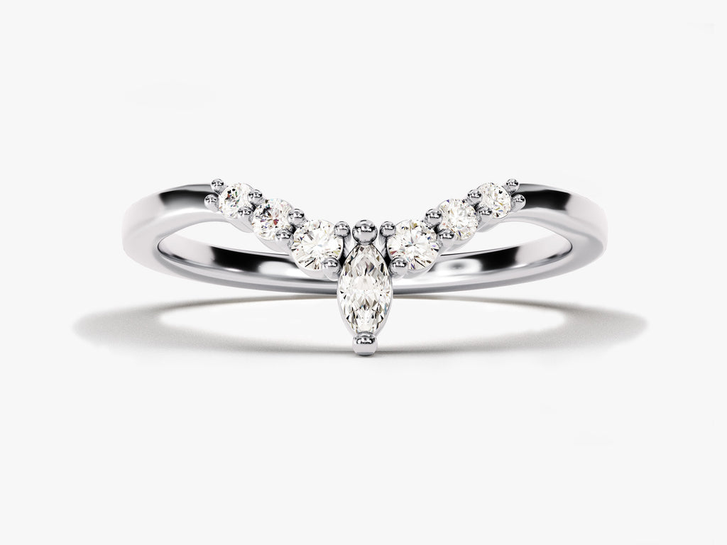 This chic crescent-shaped ring wraps effortlessly around many engagement ring styles and adds an extra beauty to them. It features a central marquise-cut diamond that’s flanked by three brilliant round diamonds on each side. This unique design will surely be one of your favorites that you will cherish for generations to come.