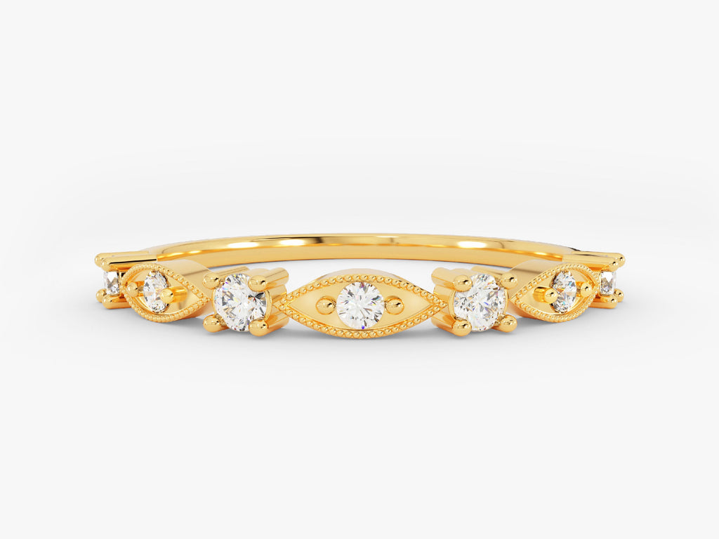 What sets this band apart is its vintage-inspired design that features intricate milgrain detailing that adds an extra layer of texture and allure. It is perfect for stacking with other rings or wearing on its own as a stunning statement piece. After all, when it comes to your special day, only the most exquisite details will do.